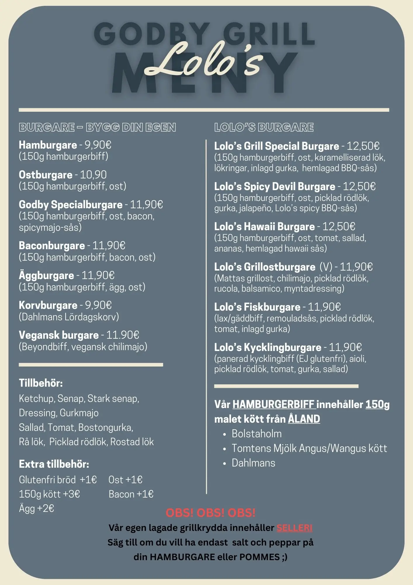 Vi tog över Godby Grill i november 2025 och driver restaurangen vidare i samma anda. Hos oss får du alltid vällagade hamburgare med goda tillbehör – både klassiker från Godby Grills originalmeny och nya favoriter!